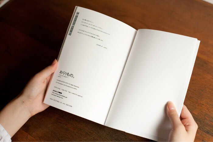 ノド部分を特殊な糊で固める、くるみ製本(無線綴じ)です。